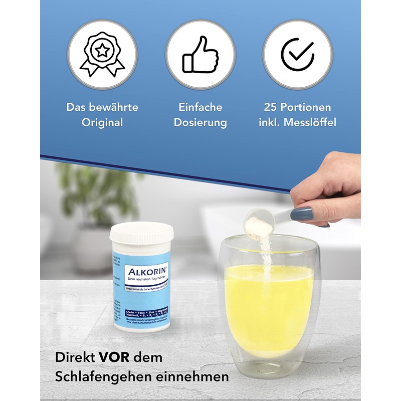 Alkorin® for the next day – Supports liver function with choline – 100 g tin for 25 uses – Base powder with magnesium, zinc, folic acid, vitamin B1 + B2 + B3 + B5 + B6 + B12