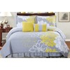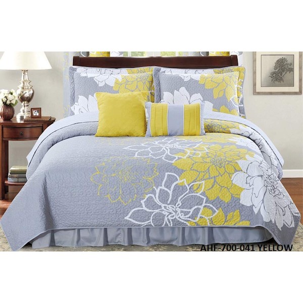 All American Collection New 6pc Flower Printed Reversible Bedspread Set with Dust Ruffle (Queen Size, Yellow/Grey)