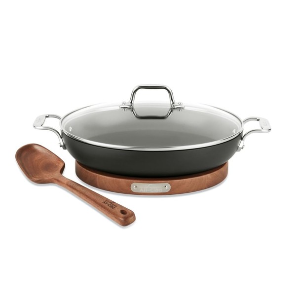 All-Clad HA1 Hard Anodized Nonstick 4 Piece Universal Set, Acacia Trivet and Spoon 3 Quart Induction Pots and Pans, Cookware Black