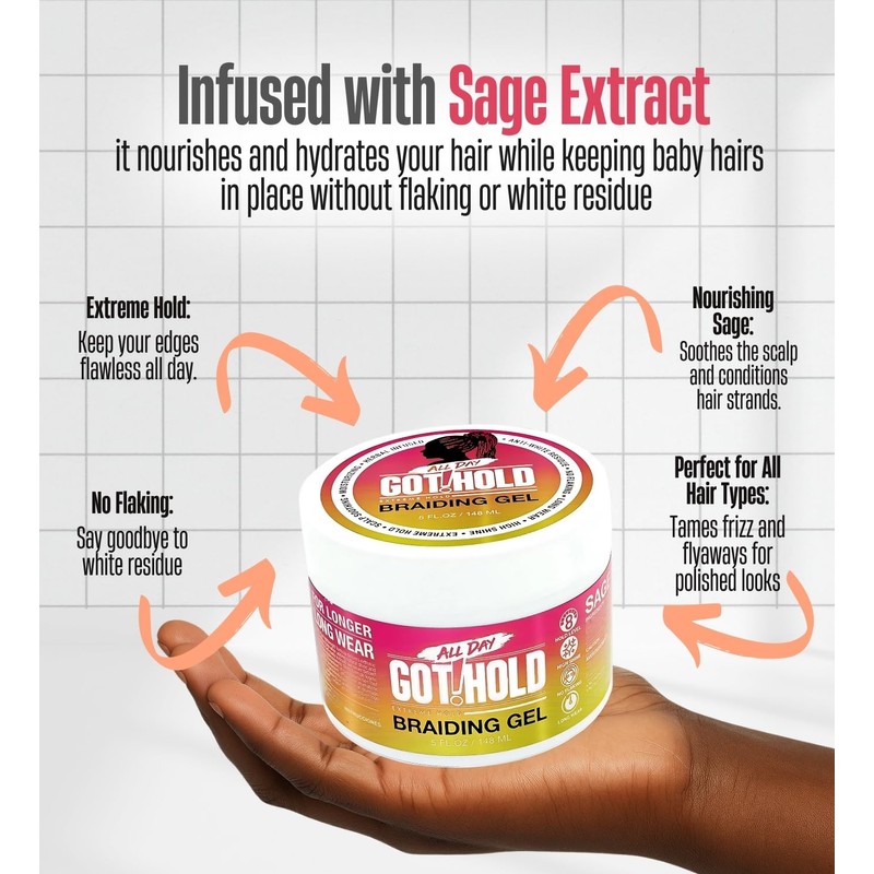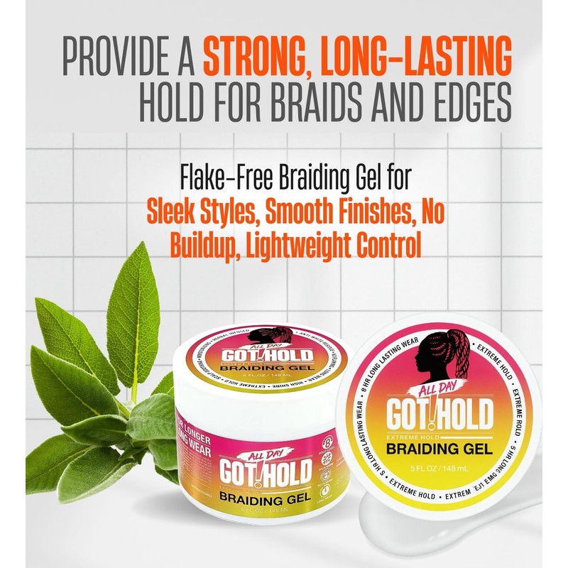 ALL DAY GOT HOLD Braiding Gel for Natural Hair Extreme Hold, Hydrating & Frizz-Free, Sage Extract, No Flaking or Drying, High Shine for Braids, Twists, Cornrows, 5oz