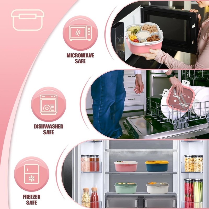 - [FRESHNESS GUARANTEED] : Our Bento Box are constructed from food-grade PP materials, free of PVC, Vinyl, and Lead. It's snug lid featuring a rubberized sealing ring and secure lock clips, ensures your food remains fresh while on the move - Completely dishwasher friendly and BPA-free.