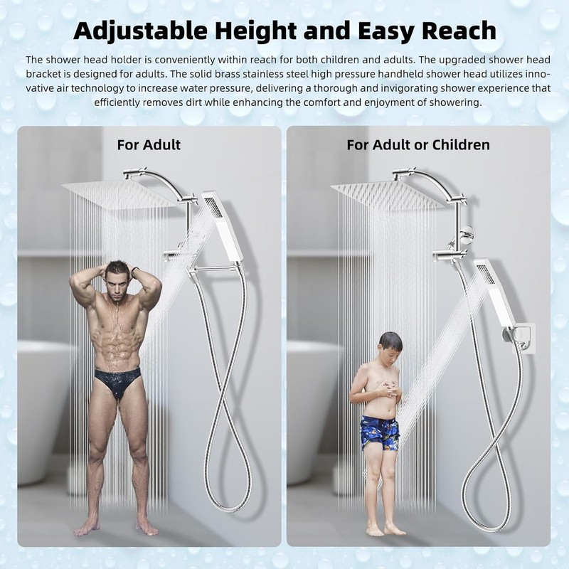 All Metal 12'' Rainfall Shower Head, Square Shower Head Combo, High Pressure Handheld Shower Wand, 16'' Adjustable Arc-Shaped Shower Extension Arm, 71'' Hose, 2 Showerhead Holders, Chrome