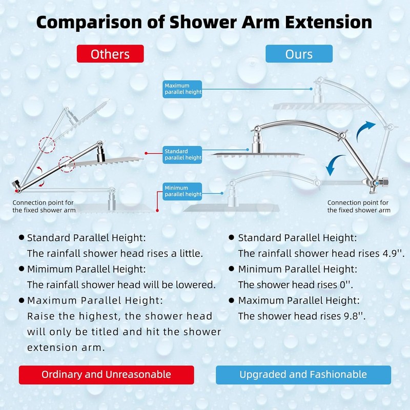 - 16'' Upgraded Shower Extension Arm: Height & angle adjustable arc-shaped design enhances its bearing capacity, high rise your shower head to achieve vertical water. Compared with the regular shower arm extender, the Hibbent shower arm extension can raise the shower head higher or lower and keep the shower head in a horizontal position all the way. The shower head is always vertical in your large size and will not hit the shower arm, instead of sloping water like an ordinary straight shower arm.
