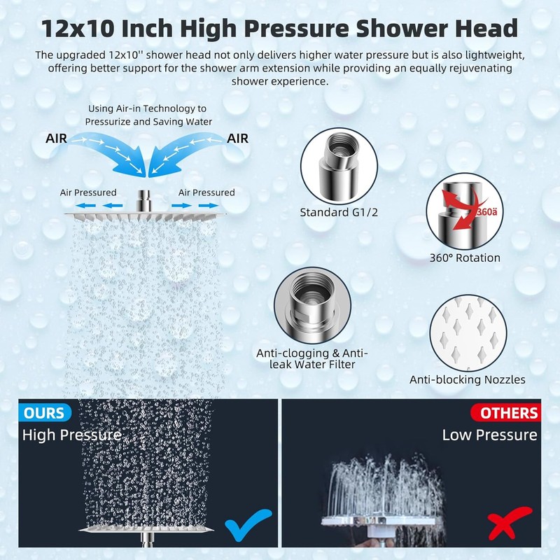 - 12x10'' Rainfall Shower Head: The large rainfall shower head is made of certified SUS 304 stainless steel, ensuring resistance to rust and long-lasting durability. Its elegant ultra-thin design, combined with air-in technology, produces a luxurious rain spray through 154 splash jets. The upgraded 12x10'' shower head not only delivers increased water pressure but is also lightweight, offering better support for the shower arm extension while providing an equally rejuvenating shower experience.