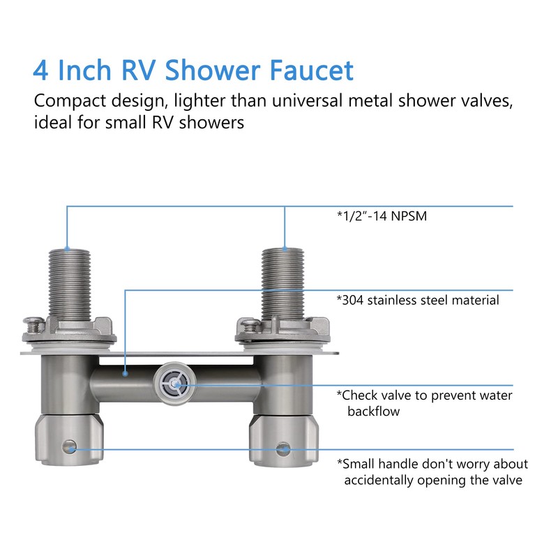 - [Premium Material] All metal 4 inch RV shower faucet uses stainless steel construction and ceramic valve core, corrosion resistant Brushed Nickel, durable and reliable, it is the perfect solution to upgrade your shower hardware.
