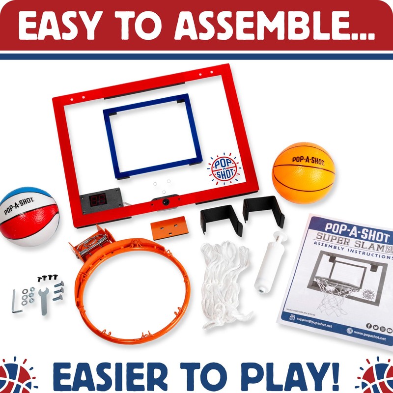 - BUILT TO LAST: The Super Slam is made for fun, but designed to last. The backboard is non-toxic ABS Plastic, which is scratch and (most importantly for dunkers) shatter-resistant. The Super Slam comes with 4 high-elastic shock-proof sponge corner pads to reduce vibration and noise when shooting and protect the door frame. And the Super Slam comes with Pop-A-Shot’s best-in-class 90-day warranty.