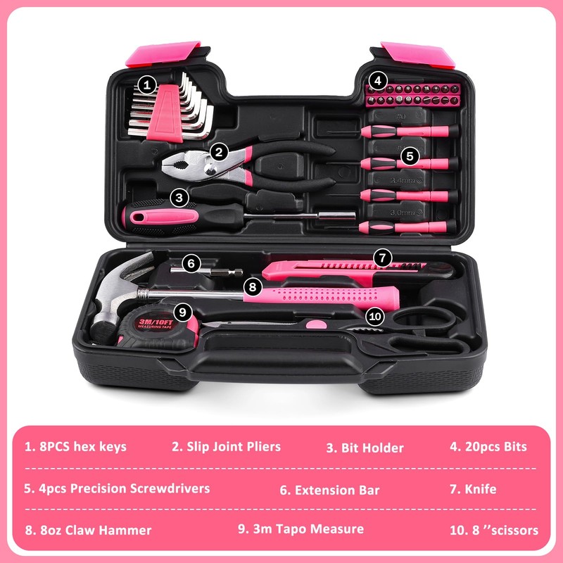 All Purpose 39-Piece Household Tool Kit Pink with Plastic Toolbox Storage Case - Includes All Essential Tools for Home, Garage, Office and College Dormitory Use