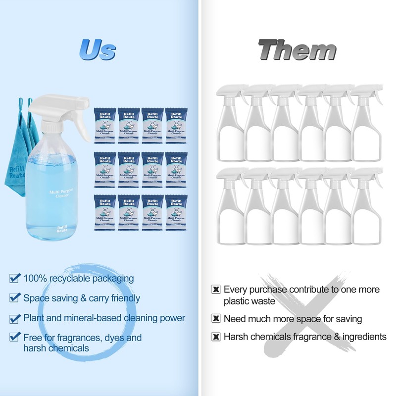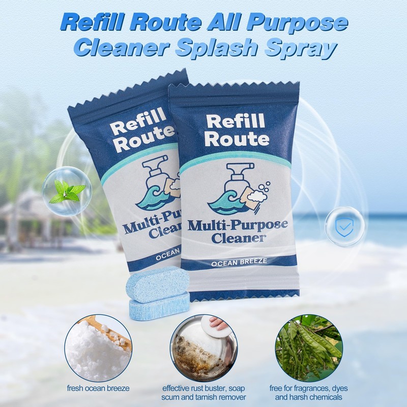 - ♻️ Refillable Packaging: Each purchase includes a durable glass cleaner spray bottle and 12 splash spray cleaner tablets in plastic-free, compostable packaging. Each pack replaces up to 12 single-use plastic bottles, and every tablet sold helps fund ocean cleanup, removing the equivalent of a 16oz plastic bottle from our oceans