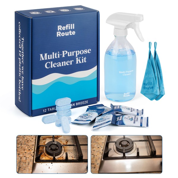 - 🧽 Long-Lasting, Complete Cleaning Kit: Your multi-surface cleaner set includes a high-quality glass spray bottle, 12 powerful cleaning tablets, and two microfiber cloths. The thickened glass cleaner refill bottle and enhanced spray nozzle offer durability and convenience, making this the ultimate choice for an all-purpose household cleaner that’s sustainable, effective, and eco-friendly