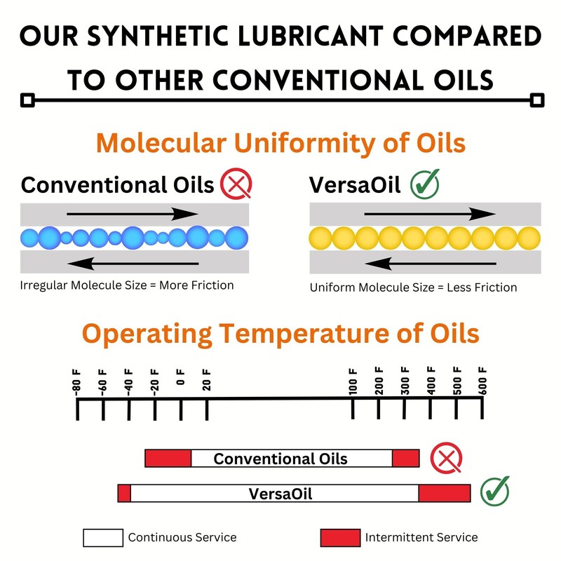 - This fully synthetic all purpose oil is engineered to outperform traditional lubricants. The molecular structure of Versa Oil gives it a wider temperature range than other common lubricants. This helps to prevent sludge from building up over time and keeps your equipment functioning smoothly.
