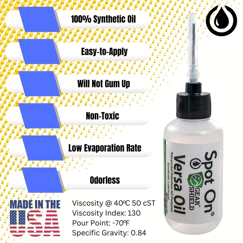 - Simply a high quality product at a fair price. Our advanced formula meets or exceeds the performance of the industry standards. Don't waste your money on a name. Save by buying premium Spot On Gear Shield Versa Oil at a fair price. Includes a full two ounce bottle of synthetic lubricant with a stainless steel needle tip for accurate application.