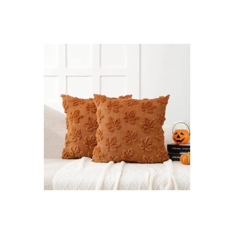 All Smiles Fall Decorative Throw Pillow Covers 16x16 Set of 2 Rust Thanksgiving Autumn Soft Plush Faux Fur Jacquard Farmhouse Home Cushion Case for Decor Living Room Couch Bed Sofa Boho,Maple Leaves