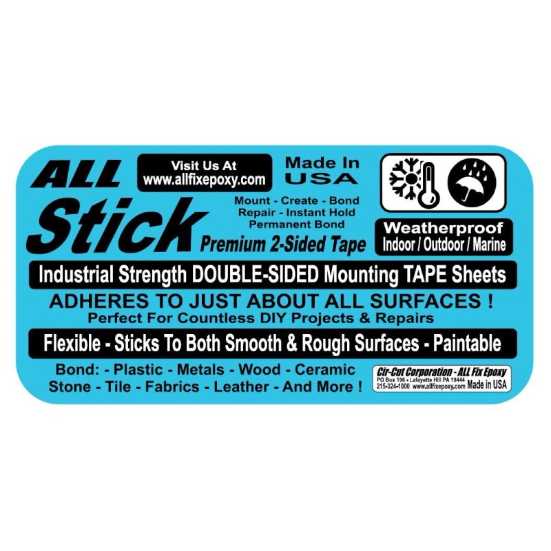All-Stick premium heavy duty mounting tape sheets is a space age double-sided bonding product that that joins materials in an instant! Unique sheet design for custom projects and applications. Provides permanent long lasting weather proof bonds to all types of materials: ceramic, plastic, stone, fiberglass, metal, wood, brick, laminates, composites, fabric, leather, glass and many more. All-Stick premium heavy duty mounting tape is specially designed for both indoor and outdoor applications. The unique flexible tape will adhere to both smooth and rough surfaces.