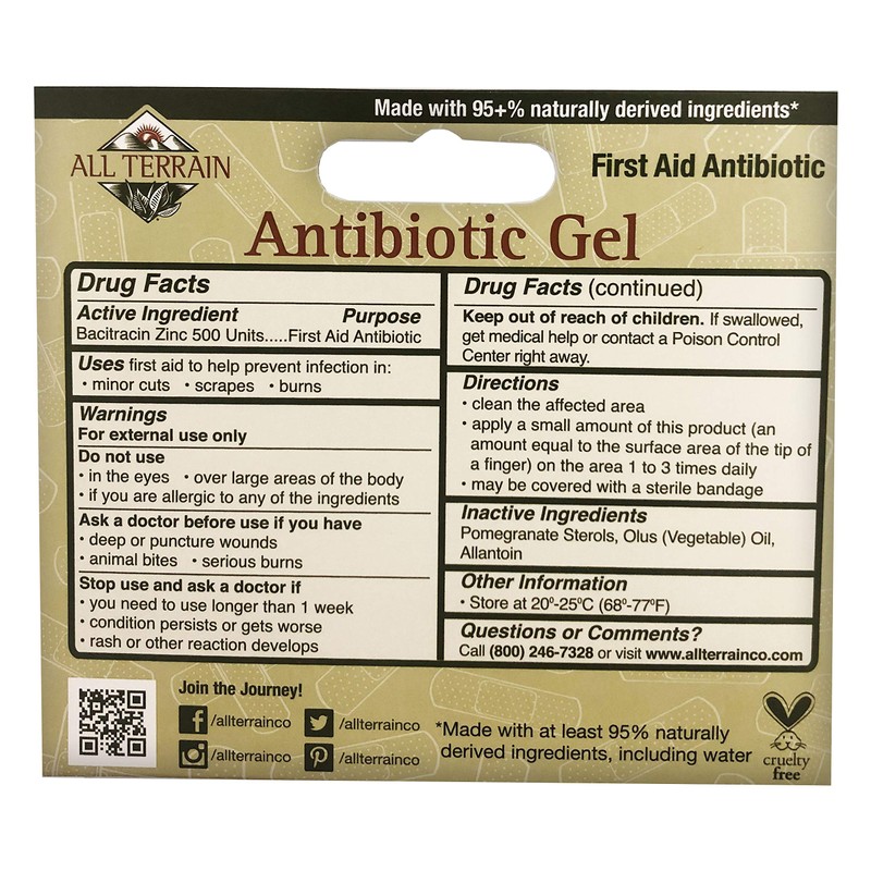 All Terrain new natural antibiotic gel is a first aid antibiotic gel & skin protectant that helps prevent infection from minor cut, scrapes & burns. It also helps prevent and temporarily relieve chafed, chapped & cracked skin. The gel's needle nose tip is convenient and easy to use. All Terrain antibiotic gel is one of the "must haves" in your first aid kit.