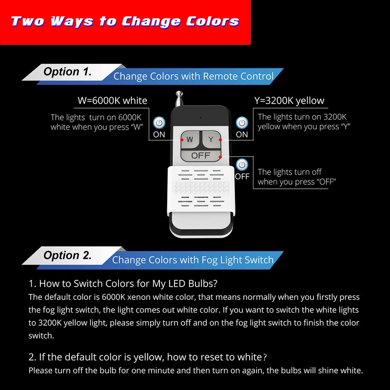 - (Set of 2) 2-way to easily switch colors: by remote control or Vehicle's Fog Lights' Switch. Remote control(1pc AAA battery included) with 3 buttons: W means when press letter W button, will turn on 6000K xenon white color; Y button is for 3000K golden yellow color; OFF means power off.