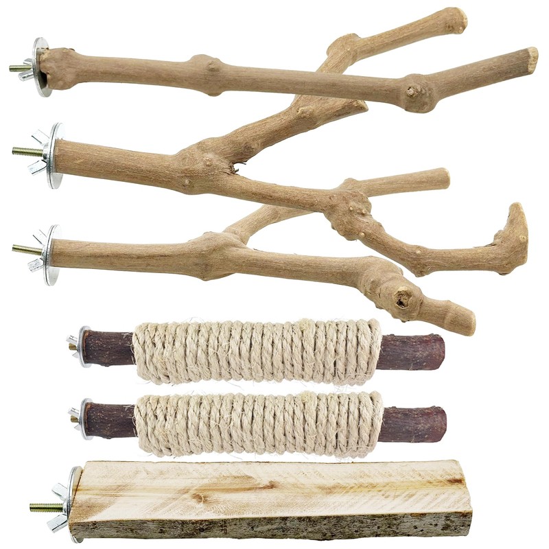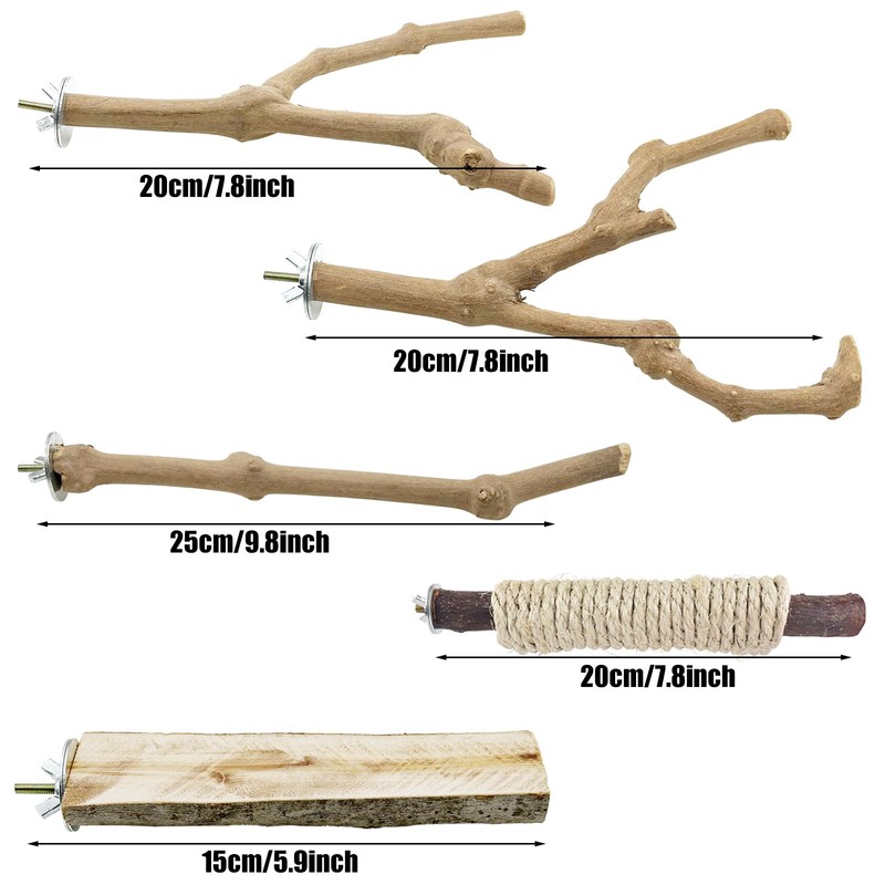 - Natural Wood Stand Bird Perch Set: 2 PCS natural bird perch hanging with rope, 2 PCS forking bird standing stick, 1 PCS rectangle platform.