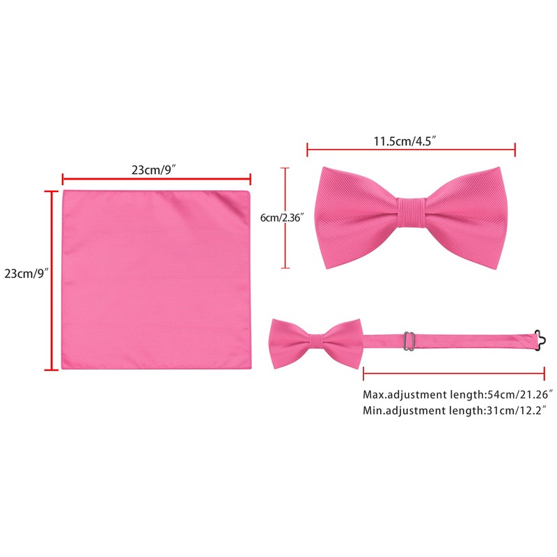 - 3 PCS in a pack: Pocket square:23x23cm/9x9". Bow Knot: 6x11.5cm/2.36x4.5". Adjustable Neck Strap: 31-54 cm/12.2"-21.26". Tie: 2.36"× 57.48"/146 ×6 cm
