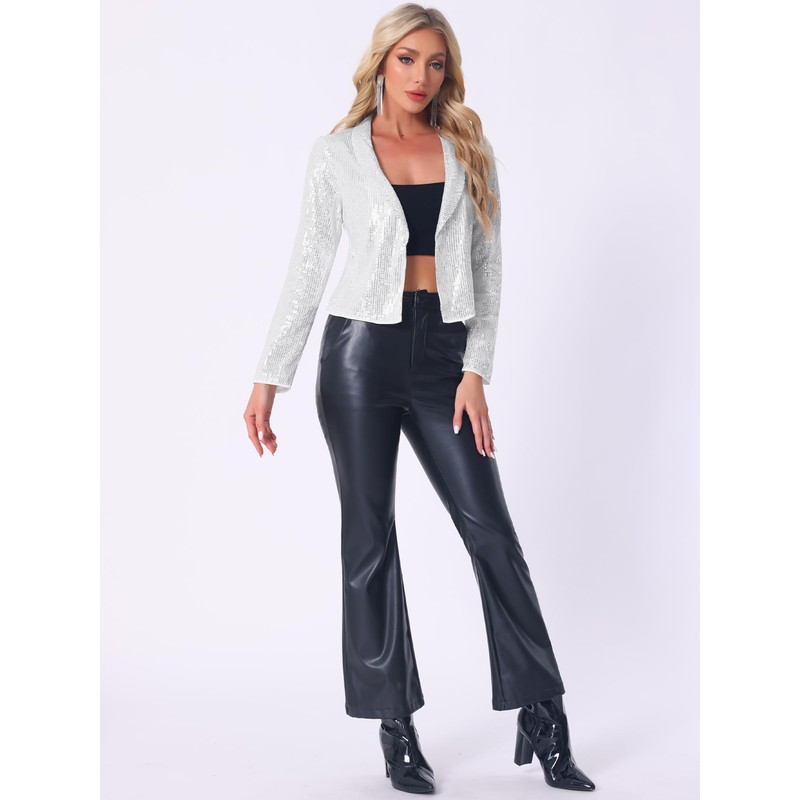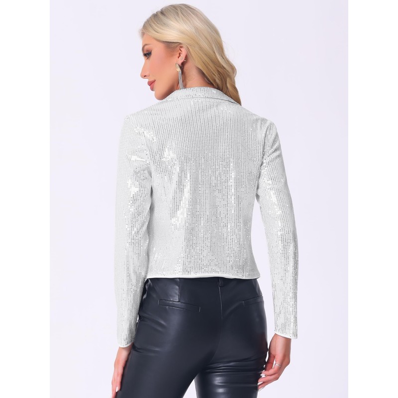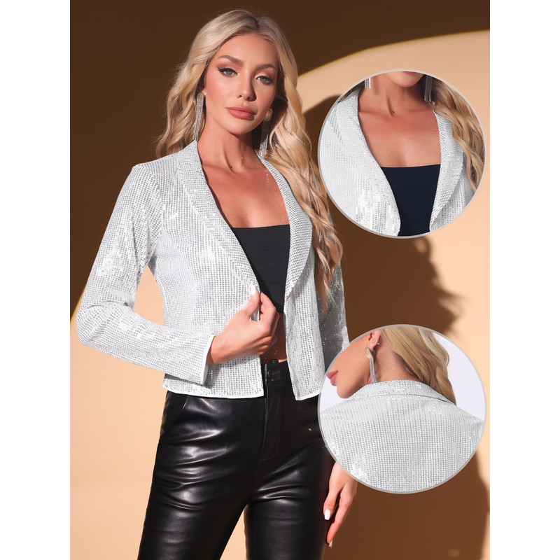 - This cropped blazer is made up of several design points: long sleeve, open front, v neck, sequins fabric, lined.
