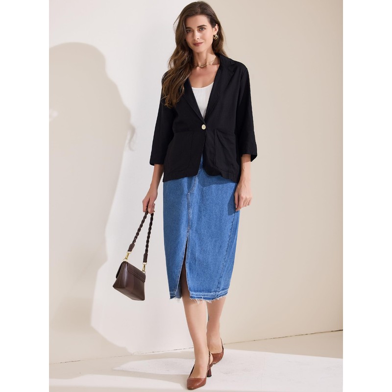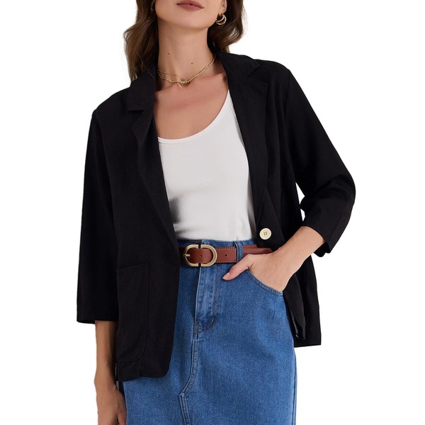 Allegra K Women's Linen Blazer 2025 Summer Lightweight 3/4 Sleeves Casual Office Work One Button Notched Lapel Suit Jacket Medium Black