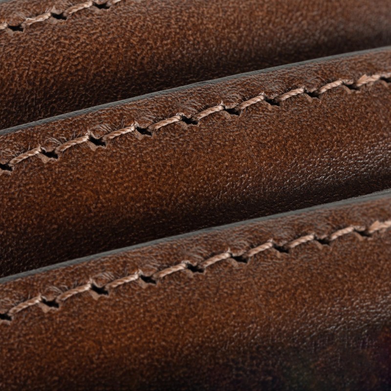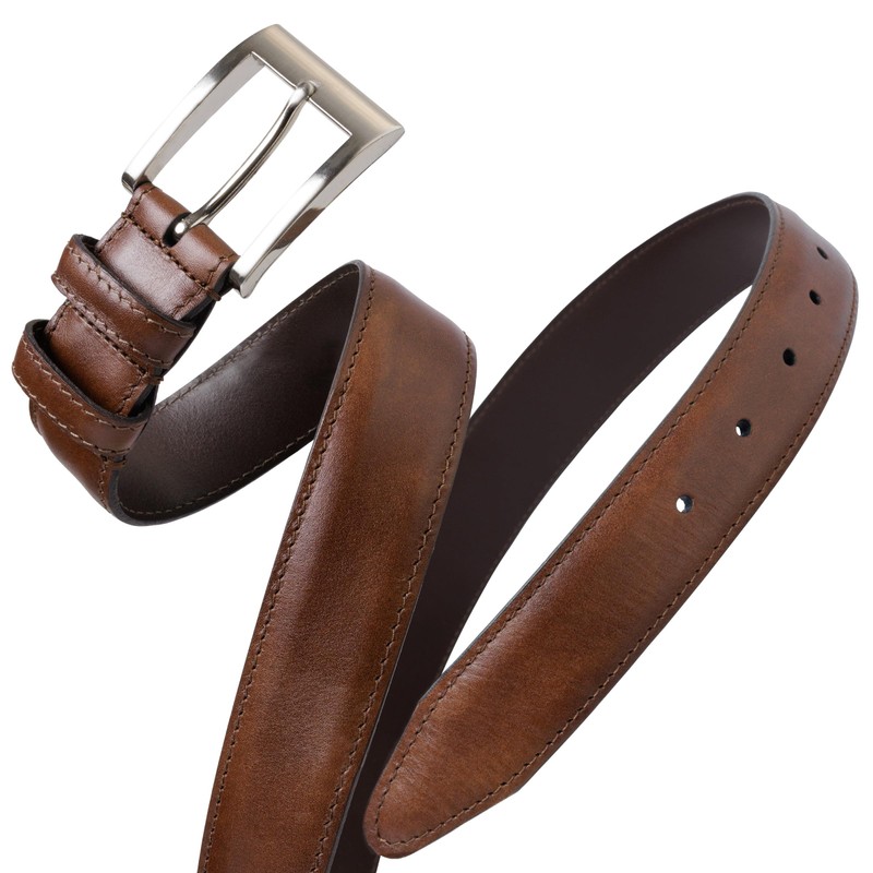 • Calf skin leather dress belt featuring silver tone buckle with debossed logo and double keepers