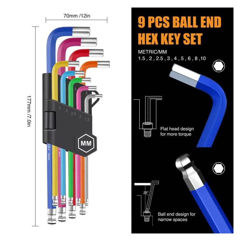 ✔️The allen wrenches' ball end can be connected to the hex screw and the entry angle can be up to 25°, makes it easier to access hard-to-reach areas and adjust from all angles.The inner hexagonal touch point is large, easy to operate and not easy to slip.