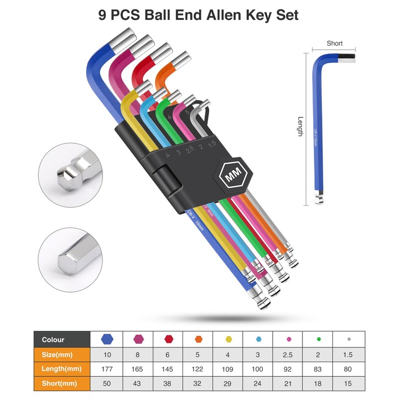 - ✔️【9PCS Alan Keys Sets】This Allen key sets including 9 different Metric Sizes: 1.5, 2, 2.5, 3, 4, 5, 6, 8, 10mm. Each Alan key is color-coded and size marked for easier identification