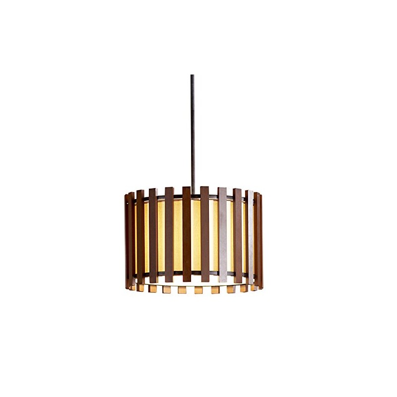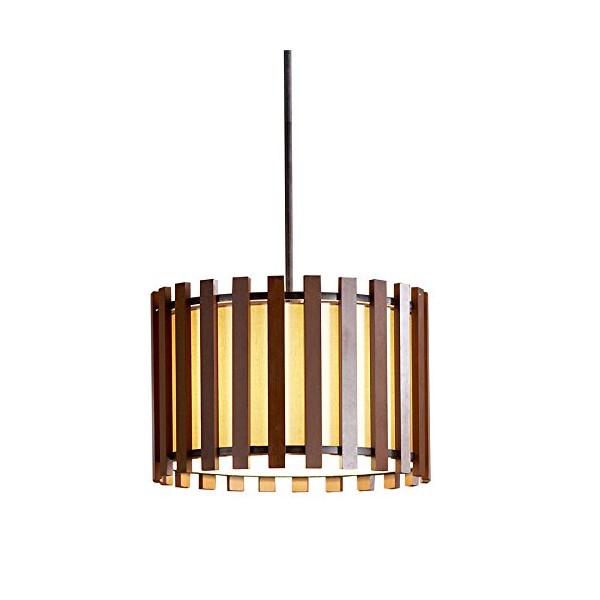 - 17.75-in diameter wooden slat pendant in a warm pecan finish with a fabric shade