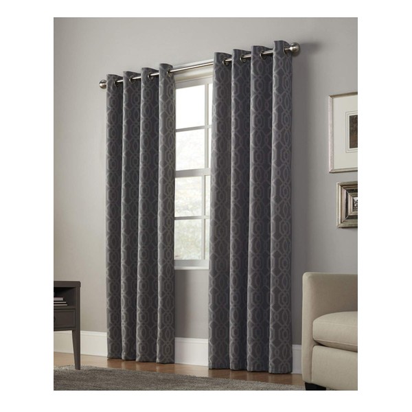 - Keldgate 84-in curtain combines a classic motif with a hint of modern charm Graphite color and ogival jacquard pattern adds a polished look to your home Light filtering fabric helps soften outside light and provides moderate privacy Polyester material is fade-resistant and machine washable for easy upkeep Grommet top treatment allows for convenient opening and closing of your curtains Easy to install using up to a 1-3/8-in thick curtain rod or decorative rod Single curtain panel