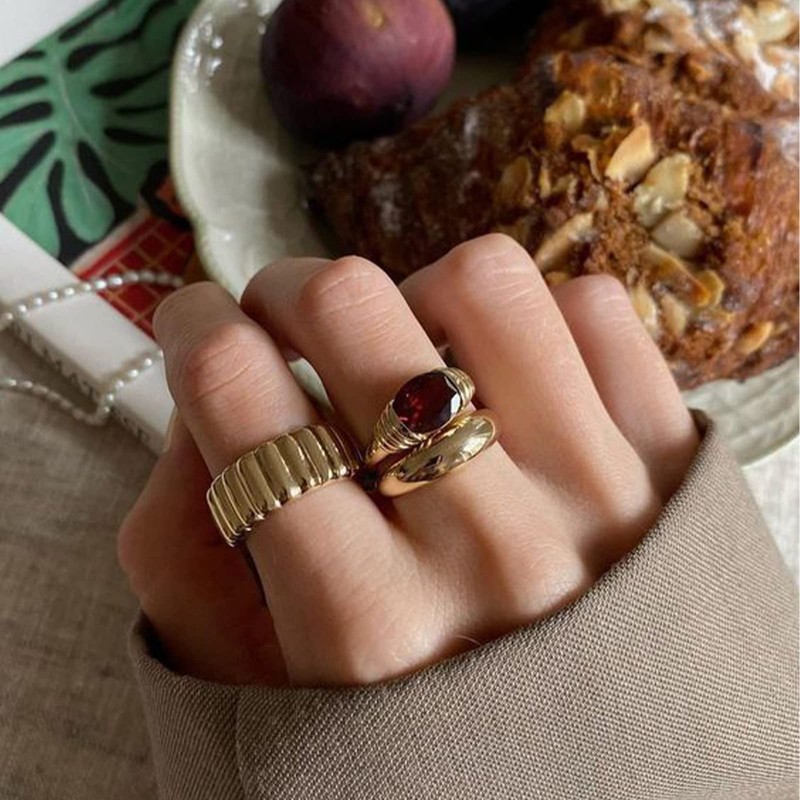 - Chunky Ring: The minimalist gold trendy ring is inlaid with a 10 mm x 8 mm cubic zirconia, beautiful eye-catching piece but not overbearing. The stone makes it quite unique and noticeable. Pairs nicely with other stacking rings.