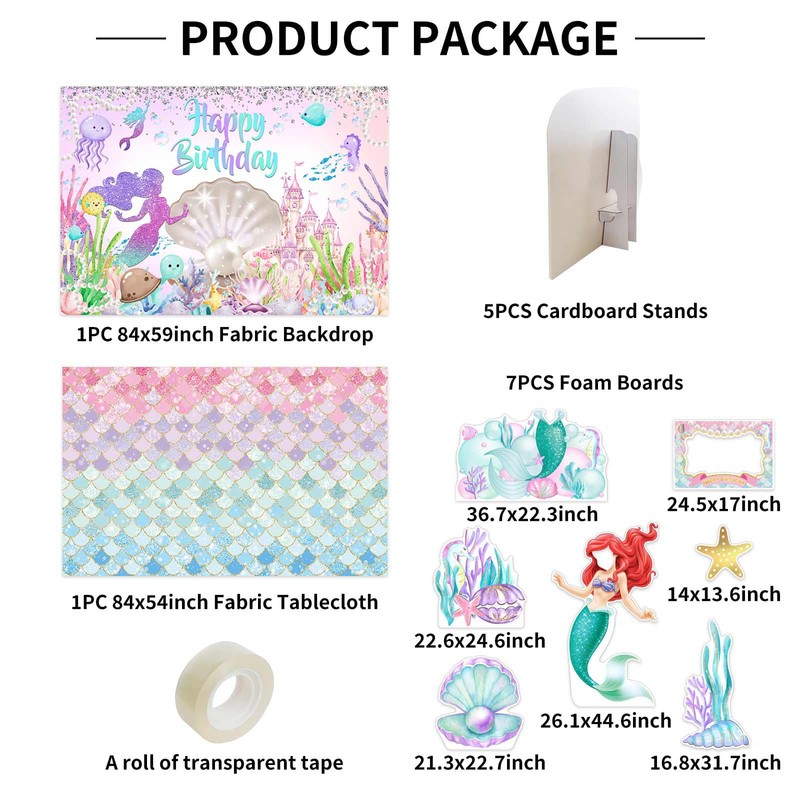 - PACKAGE CONTAINS: 1pc backdrop, 1pc tablecloth,7pcs foam boards cutouts, 5pcs cardboard stands, 1 roll of transparent tape