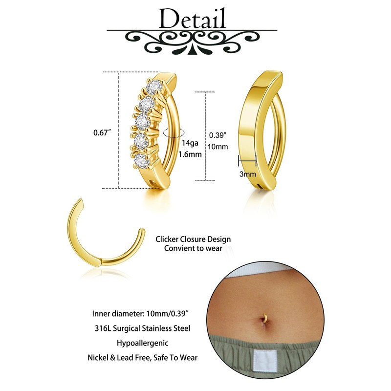 - [Clicker Belly Button Rings]: you will get 2pc different style clicker belly button rings, 1xsimple belly button clicker, 1x shiny cubic zirconia belly button ring. Classic and stylish clicker closure design, easily to remove and quickly to wear