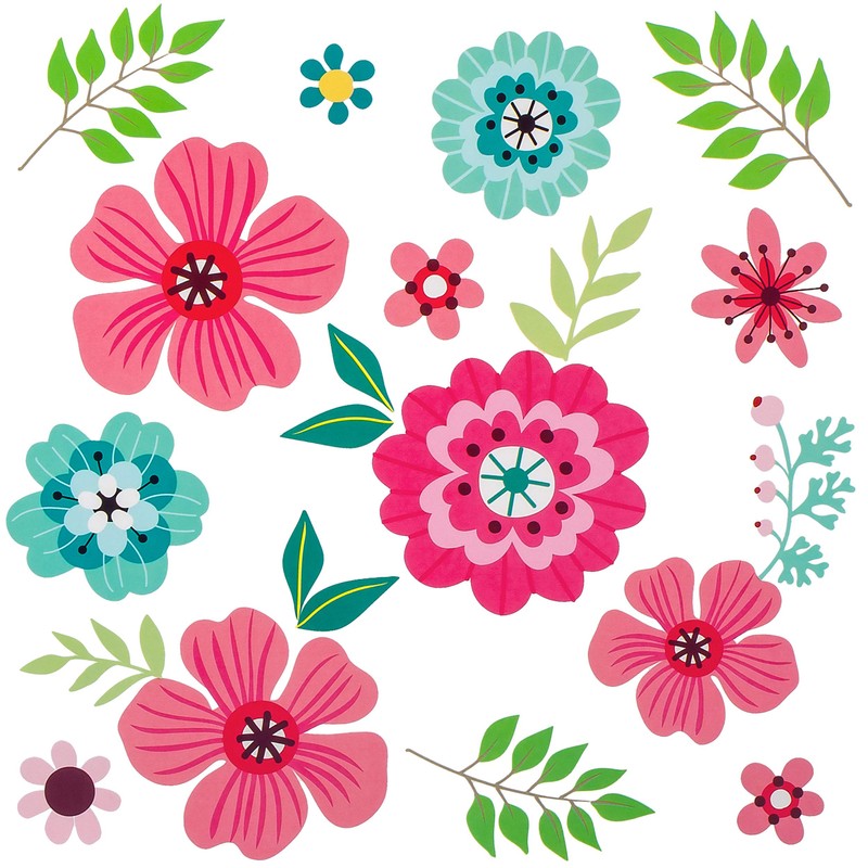 Size large flower with leaf: 14 cm wide and 12.5 cm high. The smallest flowers have 3.5 cm diameter. The individual stickers can be arranged individually or together according to your imagination