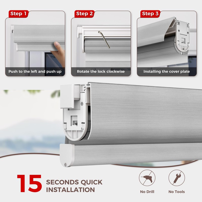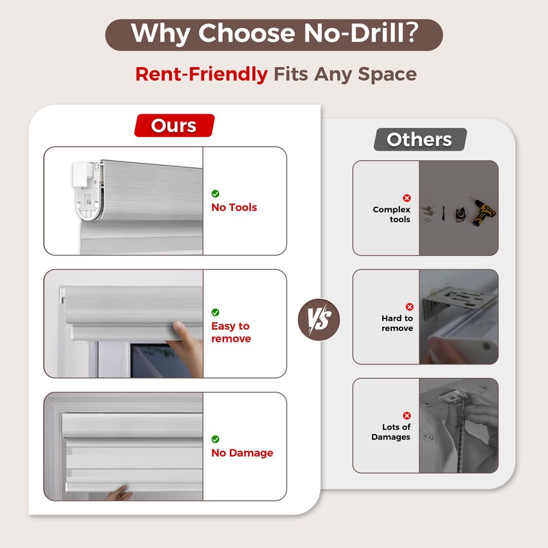 - 【NO DRILL, NO DAMAGE; NO TOOLS, NO SWEAT】No-drill zebra blinds install in just 31 seconds—no tools, screws, or brackets needed. Perfect for renters, landlords, and new homeowners. Protects walls, window frames, and tiles from damage