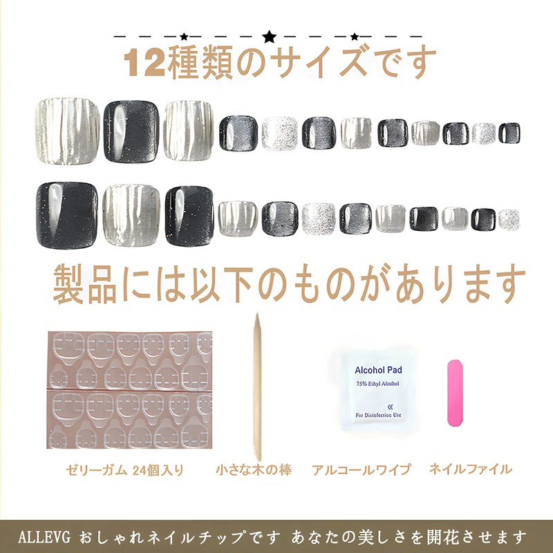 [ALLEVG]ネイルチップ 足用 黒 24枚入 フットネイルチップ フットネイル 足用 マグネットネイルチップ 夏 付け爪 結婚式 成人式 可愛い 人気...