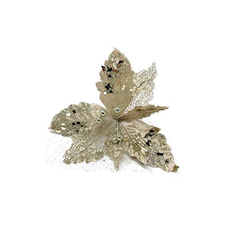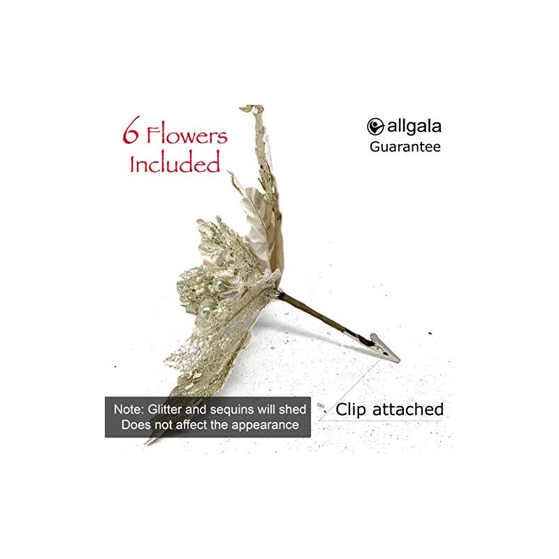 Allgala 6-PK Glitter and Sequin Decorated Fabric Poinsettia Artificial Christmas Flower with Clips-Champagne-XF93306