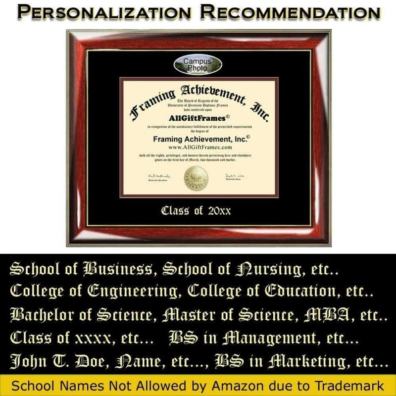 - Personalization of 1 line with maximum of 35 characters (including spaces) by Gold or Silver Embossing in Old English Font (School Name Prohibited due to copyright). Email us through AchievementGifts or AllGiftFrames if you have questions
