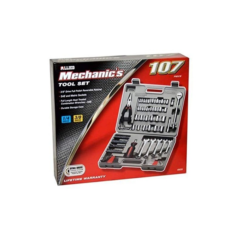 The Allied International 49028 107-Piece Automotive Tool Set provides a full set of tools for work on your car. Parts include a variety of wrenches, bit driver, cushion grip pliers, 3/8-inch and 1/4-inch standard sockets, and a 3/8-inch full polish reversible ratchet. This set is backed by a lifetime warranty.