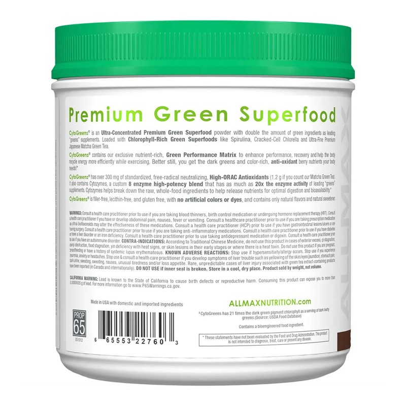 - GREEN SUPERFOOD FORMULA - ALLMAX CYTOGREENS is an Ultra-Concentrated Premium Green Superfood Powder. It’s loaded with chlorophyll-rich green superfoods like Spirulina, Spinach, Barley Grass, Chlorella & Japanese Matcha Green Tea.