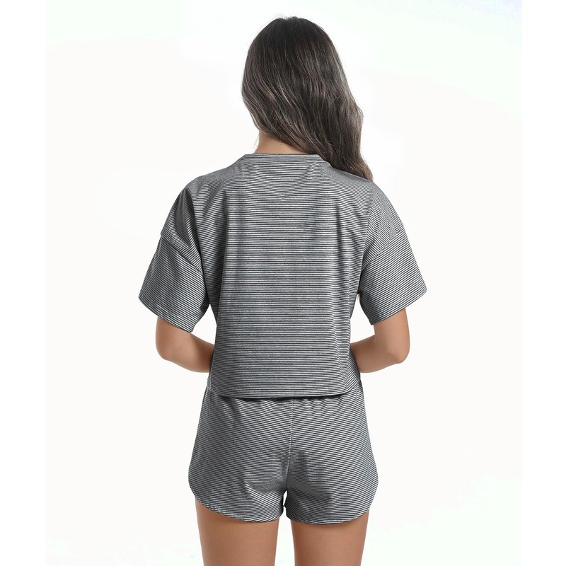 Allmloers Womens Split Short Pajama Set Striped Short Sleeve Crewneck Tee and Side Slit Sleepwear Set 2 Piece Cotton Pjs Set Black