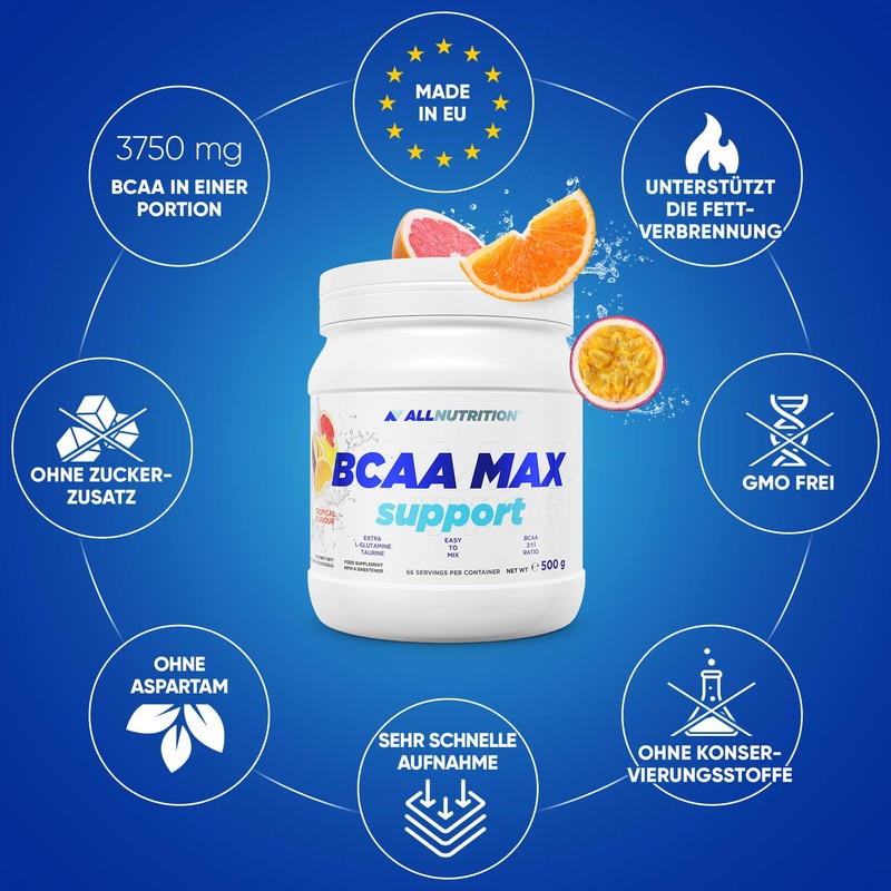 - BESSERE LEISTUNG: BCAA MAX SUPPORT ist ein Komplex aus BCAA-verzweigten Aminos?uren im Verh?ltnis 2: 1: 1 (L-Leucin: L-Valin: L-Isoleucin), dessen Zweck es ist, den K?rper sowohl w?hrend als auch nach dem Training zu untersttzen. Das Produkt enth?lt auch L-Glutamin und Taurin. Zum Verzehr vor und nach dem Training bestimmt.