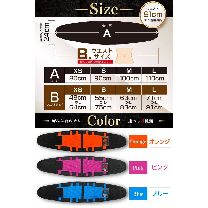 - Sizes: Size XS: Waist 18.9 - 25.2 inches (48 - 64 cm), S: Waist 21.7 - 29.5 inches (55 - 75 cm), M: Waist 24.8 - 32.7 inches (63 - 83 cm), L: Waist 28.0 - 35.8 inches (71 - 91 cm). Waist shaper from ALLOU, the NO1 training gear brand in Japan. Buy with confidence knowing that you are getting genuine ALLOUT