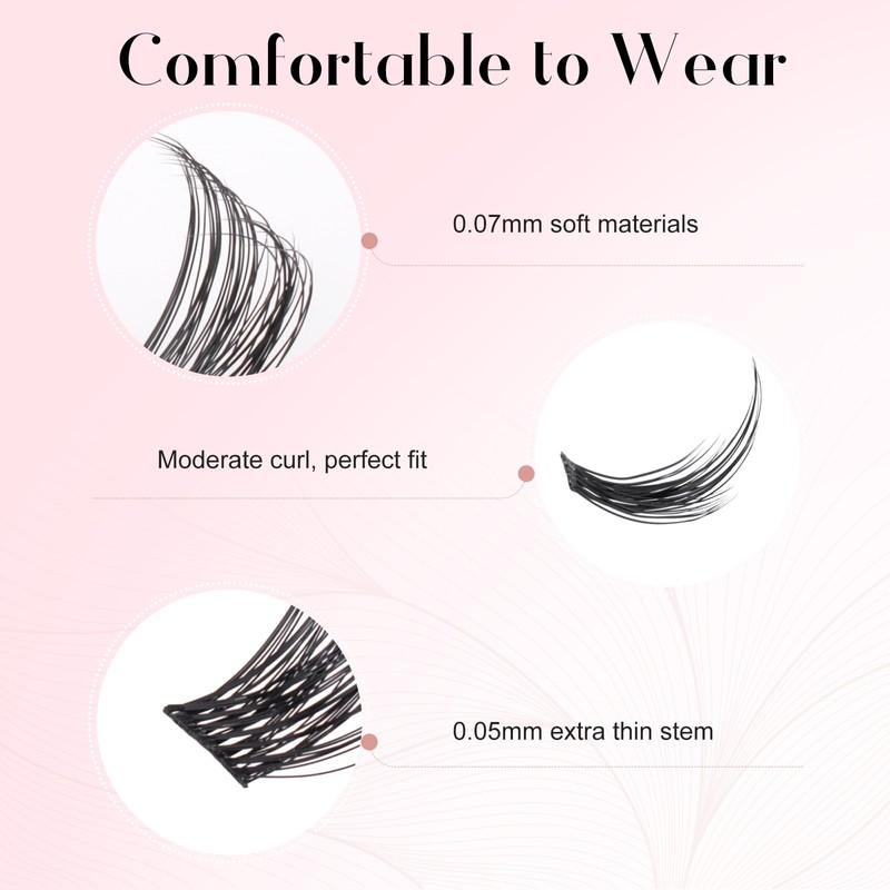 - Double Bonded Wire without Separate: The lash stems are double bonded-wired to ensure that the cluster lashes don't fall out easily even under external forces. The stems are thinner than traditional cotton stem for a more comfortable fit.