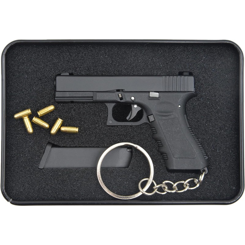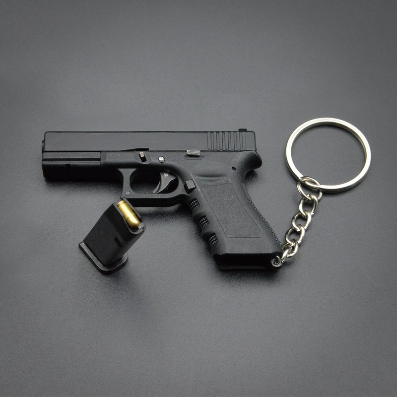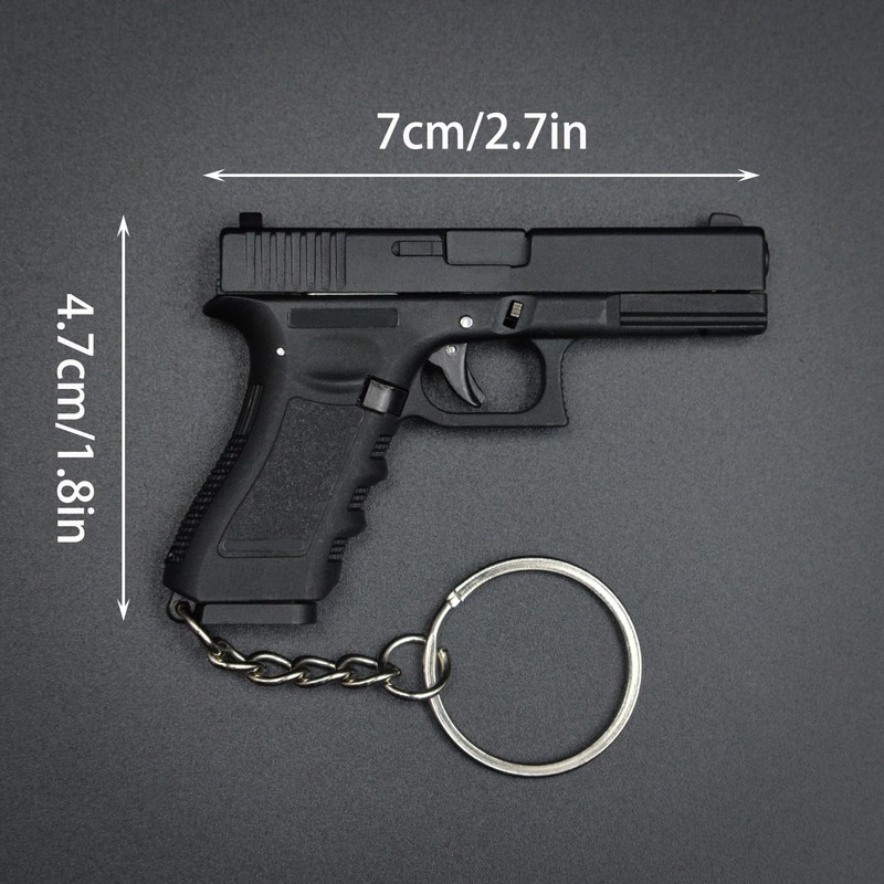 - Feature This is a pistol shaped keychain accessory with a realistic model. It can simulate the charging process and realise a cavity suspension. The magazine can be disassembled and makes a sound when the trigger is pressed.