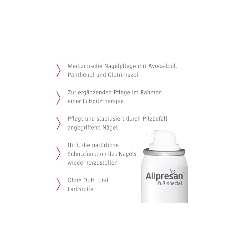 - Medical nail care: The Allpresan foot special no. 7 nail tincture with avocado oil, panthenol and clotrimazole has been developed for special, complementary care as part of athlete's foot therapy