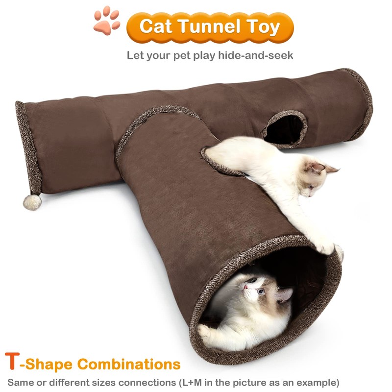 - T Combination: you can assemble 2 sizes into a new tunnel, make a U-bend by connecting the ends together, and assembling with other tunnels of the same diameter. In this way, you can create a maze for your pet and give your cat more fun.