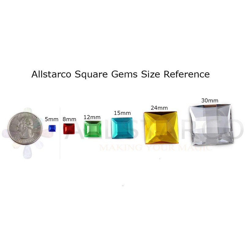 Square Acrylic (Plastic) Flat Back Rhinestones are 8mm or 5/16" in diameter. CPSIA and RoHS compliant. Professional Grade. Perfect for jewelry making, fabric embellishments. Great for garments embelishments Costume making, cosplays. Also used for cards and invitations, face painting and body art. Domestic made high quality gemstones are also highly suited for apparel and accessories manufacturing. Since they lead free they are 100% safe for skin and can be used as body gems. Use your own glue. These are NOT self adhesive (stick on)