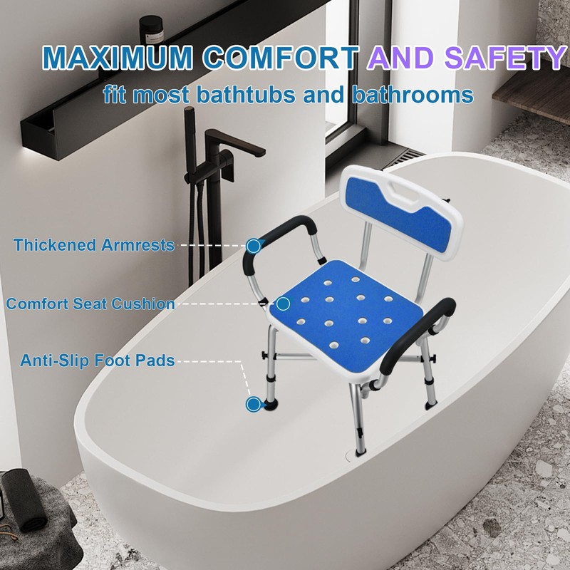 - Comfortable Shower Chair With Arms: Our bath chair has been carefully designed with space and comfort in mind. The EVA material cushion ensures it is not too cold when it comes into contact with the skin. The spacious shower chair and non-slip armrests make this shower seats for adults loved by more people.