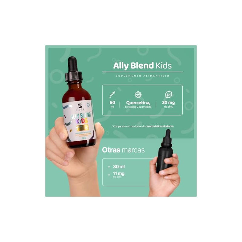 - ¡Ally Blend Kids Gotas B Life, protección para los más pequeños! Nuestra innovadora composición sabor naranja integra boswelia y quercetina, potenciada con zinc y vitamina C. Esta poderosa combinación aporta vitaminas y minerales esenciales a los niños. Una formulación exclusiva que no ofrecen otros productos.