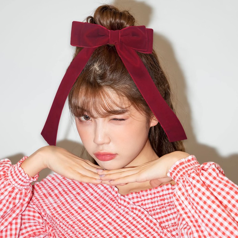 ALLY-MAGIC Black Velvet Hair Clip with Long Ribbon Big Bow Bowknot 2 Pcs French Hair Barrettes for Adults Kids Party Hair Accessories Gift Y2-SRHDFJ (Black + Red)
