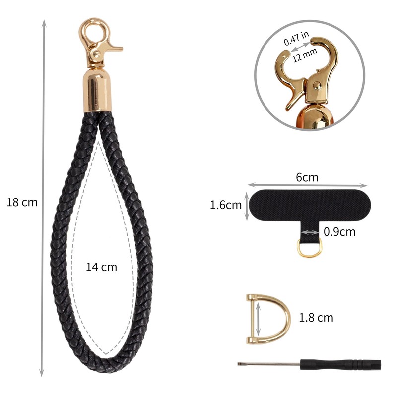 - Package includes: 1 x leather rope wristlet keychain,1 x D-ring, 1 x cell phone tether tab, 1 x quick-release connector, 1 x screwdriver (help you open the D-ring)